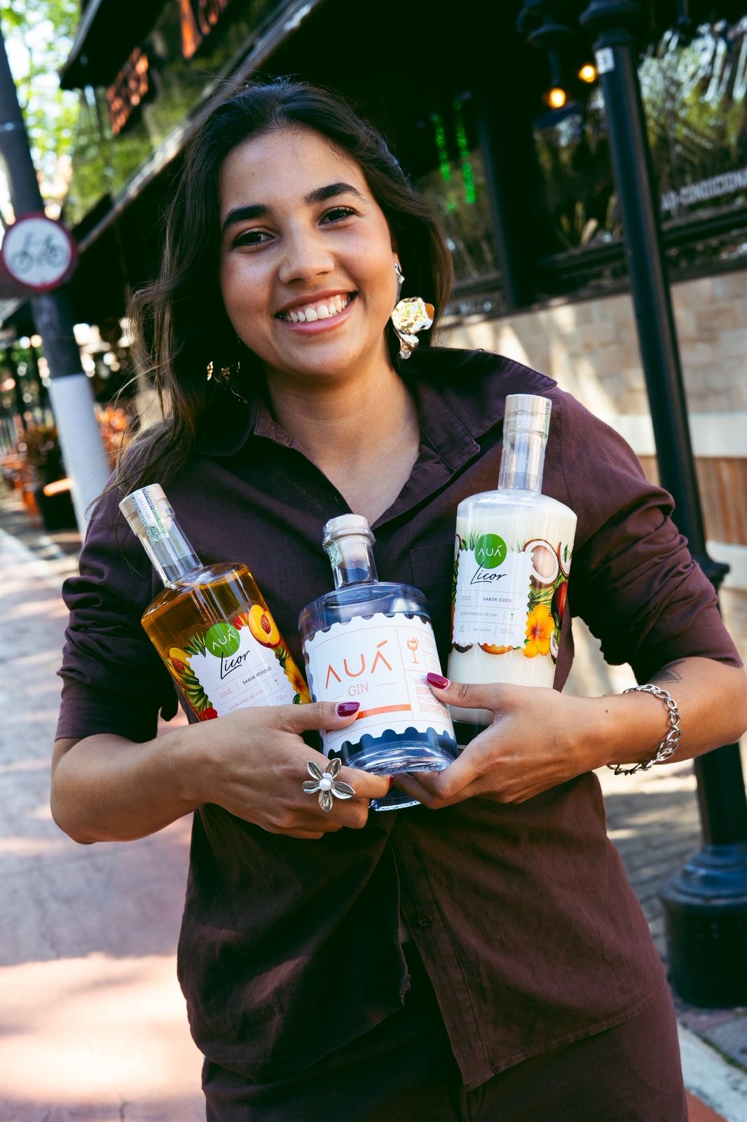 Durante uma viagem a São Roque, no interior de São Paulo, meu marido Guilherme e eu decidimos explorar a famosa rota do vinho, onde tivemos a oportunidade de conhecer uma renomada destilaria de gin. Isso ocorreu em 2022, no final da pandemia. Eu havia acabado de me formar em Engenharia Química, enquanto o sonho do Guilherme era empreender. Fiquei fascinada pelo processo da destilaria e disse a ele que, se fosse para empreender, gostaria que fosse de maneira semelhante àquela destilaria. Na mesma semana, busquei um curso sobre bebidas destiladas, onde consegui desenvolver a receita do AUÁ. Em seguida, procuramos uma produção terceirizada para materializar nosso projeto.