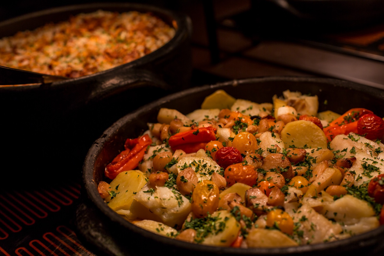 A experiência começa com uma seleção generosa de entradas e saladas, que inclui salmão curado na beterraba, pêssegos tostados com queijo de cabra, vegetais orgânicos de Morungaba na brasa e uma sofisticada estação de frutos do mar, com ostras frescas nativas de Cananeia, camarão ao rum e poke de atum. Os pratos quentes seguem a mesma linha de conforto e sofisticação, com destaques como bacalhau gratinado com palmito pupunha, caldeirada vegana de banana-da-terra com algas e o carré de cordeiro com pimenta Cambuci e hortelã.