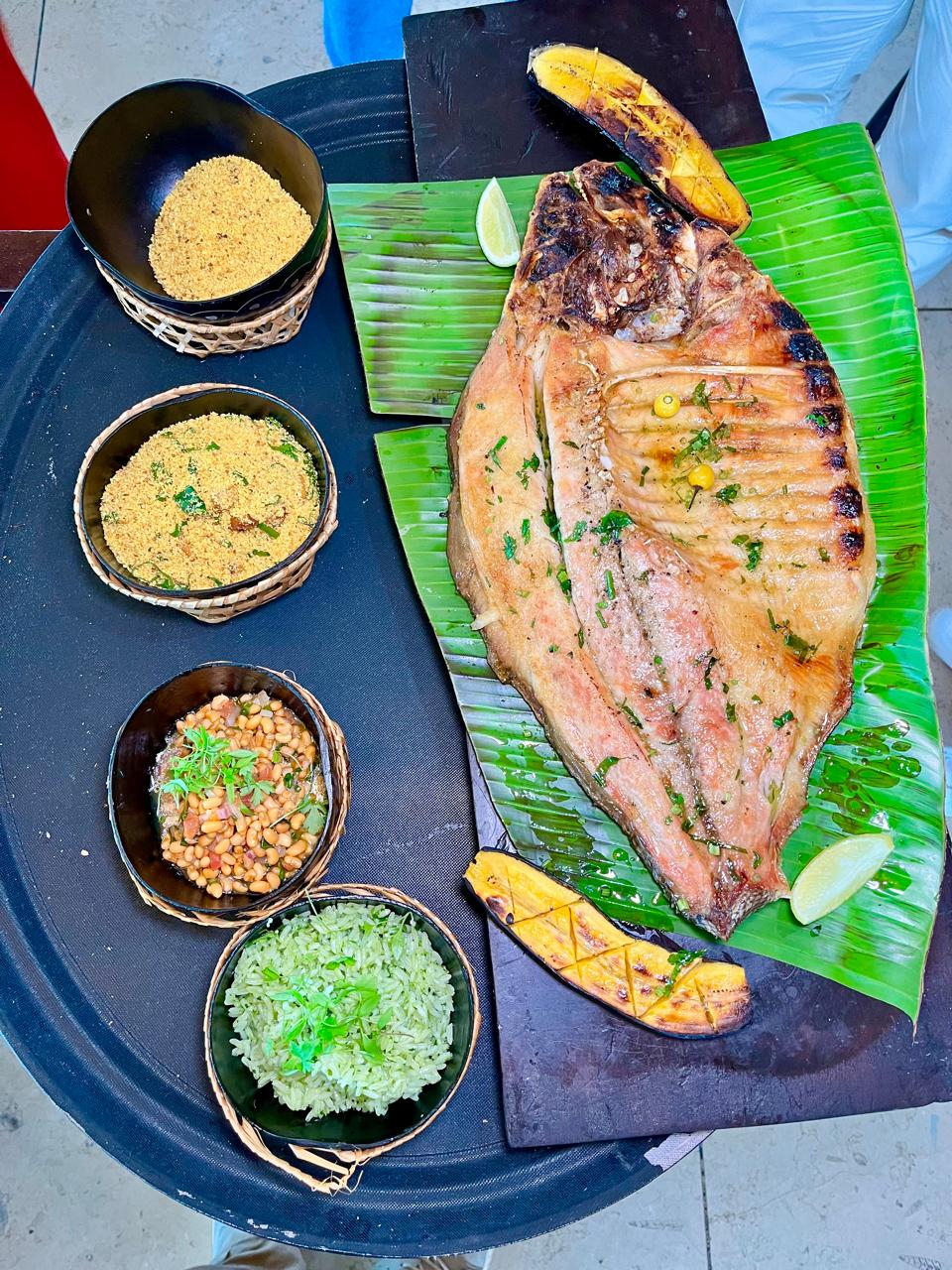 Vale destacar um prato para compartilhar que simboliza bem todo o clima da casa e teletransporta o comensal para as praias de Alter do Chão. Trata-se de uma Piracaia (R$ 189), inteira assada e servida com banana-da-terra, arroz de chicória, vinagrete de feijão de Santarém e farofa de também banana-da-terra.