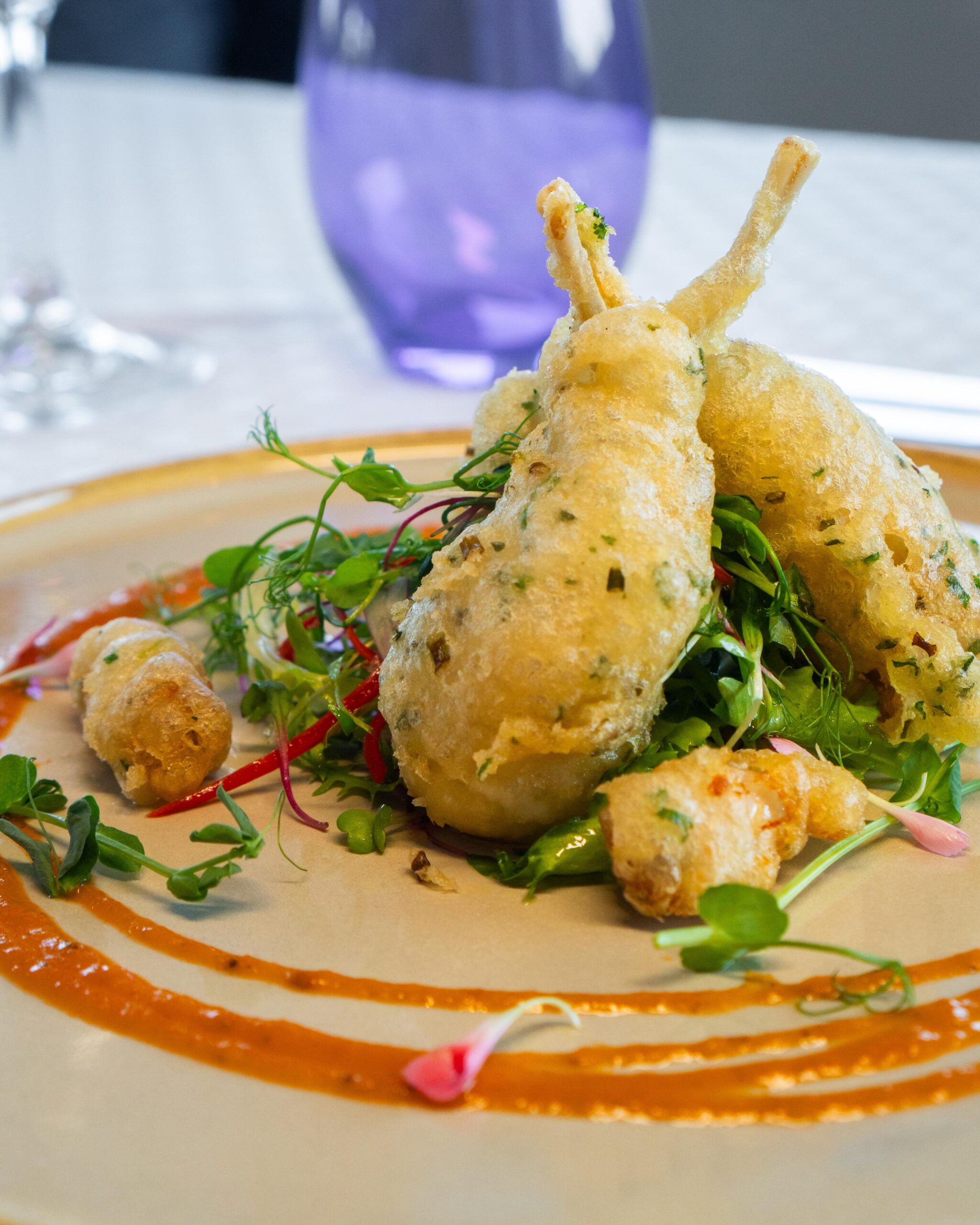 O cardápio em seis tempos combina clássicos reinventados com toques contemporâneos: coxas de rã em tempura de ervas, crudo de vieiras com caju, socarrat caiçara de frutos do mar e costela presidencial braseada lentamente, servida com aligot de batata-baroa.